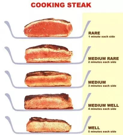 千万记得well-done在牛排馆可不是干得好的意思哦!根据火候不同,牛排的吃法从全生一直到全熟都有,不同火候的特征和术语如下。