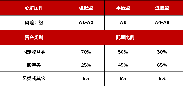 首先,你要知道自己的风险承受能力,才能决定自己投资组合中每个品种的比例。这就像吃菜,撒多少盐,取决于您的口味有多重。如果您可以承受短期30%的亏损,那么多配置点股票产品可以增加收益;可如果亏5%就觉得要窒息了,那还是老老实实多配点固定收益产品比好!所以,招商银行按照现在的最新形势,根据不同的心脏类型,特别制定了各类资产配置的建议表!LOOK!是不是很暖心!