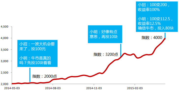 如果这个时候牛市喘气,回调20%,小招的收益还有60%,而小明同学居然亏了10%。LOOK!这么牛的牛市还亏钱,情何以堪啊!