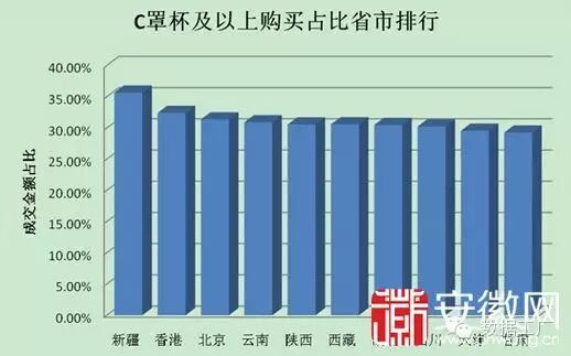 淘宝数据平台显示,购买最多的文胸尺码为B罩杯。B罩杯占比达41.45%,其中又以75B的销量最好。其次是A罩杯,购买占比达25.26%,C罩杯只有8.96%。在文胸颜色中,黑色最为畅销。以省市排名,胸部最大的是新疆妹子。